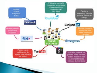 El documento analiza la evolución de las redes sociales desde sus inicios, destacando eventos y plataformas clave a lo largo del tiempo. Se mencionan redes sociales orientadas a diversos intereses, como el contacto personal y profesional, así como estadísticas sobre su uso en todo el mundo. Además, describe características específicas de algunas de las redes más populares, como Facebook, Twitter, LinkedIn y Google+.