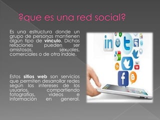 Las redes sociales son plataformas que facilitan la interacción y socialización entre usuarios, permitiendo la creación de vínculos amistosos, laborales y comerciales. Estas redes, como Facebook y LinkedIn, ofrecen ventajas en términos de socialización, búsqueda de empleo, expansión de negocios e intercambio de información relevante, aunque también presentan riesgos como el ciberacoso y la adicción. Su uso requiere precaución debido a la exposición de datos personales y la posibilidad de ser víctimas de delitos.