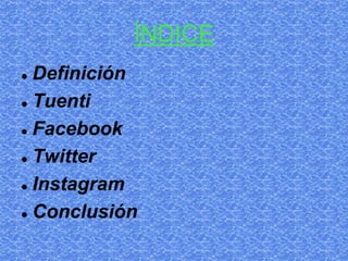 El documento resume varias redes sociales populares como Tuenti, Facebook, Twitter e Instagram. Define las redes sociales como páginas para comunicarse con amigos y conocer otras culturas. Explica que Tuenti y Facebook permiten compartir fotos y mensajes con amigos, mientras que Twitter permite enviar mensajes cortos a seguidores y seguir a otros. También describe que Instagram es para compartir fotos con efectos y filtros entre redes sociales.
