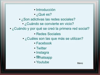 Este documento resume las principales redes sociales, incluyendo su origen, características y ventajas/desventajas. Explica que las primeras redes sociales surgieron en 1995 y que actualmente las más populares son Facebook, Instagram, Twitter, WhatsApp y YouTube. Brevemente describe el propósito y funcionalidad de cada una.