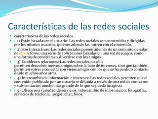 Las redes sociales permiten a los usuarios establecer conexiones basadas en intereses comunes, compartir información e intercambiar contenido. Están construidas y dirigidas por los propios usuarios y ofrecen características como chats, foros, aplicaciones de juegos y herramientas para descubrir nuevos amigos y contactar con antiguos conocidos. Algunas de las redes sociales más populares son Facebook, Twitter, Instagram, WhatsApp y Skype.