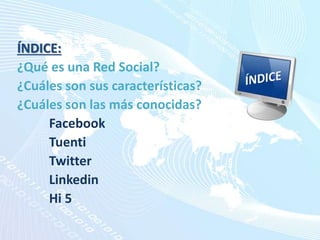 Este documento describe varias redes sociales populares como Facebook, Twitter, Tuenti, LinkedIn y Hi5. Define una red social como una estructura formada por un grupo de personas que comparten intereses a través de Internet. Explica las características comunes como ser gratuitas y usar el color azul. Luego detalla los orígenes, características y funciones principales de cada red social mencionada. Finalmente, concluye que las redes sociales son útiles para la comunicación y entretenimiento, pero ninguna es adecuada específicamente para la educación.