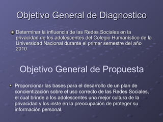 Este documento analiza cómo influyen las redes sociales en la privacidad de los adolescentes de un colegio en Ecuador. Tiene como objetivos describir la influencia de las redes sociales en las relaciones interpersonales de los adolescentes, determinar su impacto en la privacidad y acceso a información personal, y diferenciar cómo protegen sus datos quienes conocen los riesgos versus quienes no. Finalmente, propone construir un plan para crear conciencia sobre el uso correcto de redes sociales y la protección de privacidad.