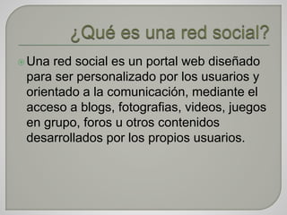Las redes sociales son plataformas web diseñadas para que los usuarios se comuniquen y compartan contenido como blogs, fotos y videos. Su objetivo principal es poner en contacto e interconectar a personas de una manera sencilla y rápida. Permiten la interacción entre usuarios compartiendo información y facilitando nuevas relaciones que a menudo se extienden más allá del mundo online.