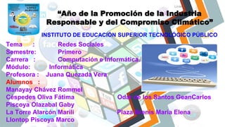 El documento proporciona información sobre redes sociales. Brevemente describe que las redes sociales son estructuras sociales compuestas de personas conectadas a través de relaciones como amistad o intereses comunes, y que existen diferentes tipos como profesionales u horizontales. También menciona algunas ventajas como la comunicación y desventajas como la falta de privacidad.
