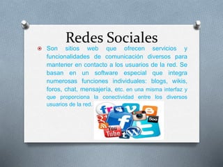 Las redes sociales son sitios web que ofrecen diversas funciones de comunicación como blogs, wikis, foros y chat para mantener a los usuarios conectados. El documento lista las redes sociales de Fátima Mendoza, incluyendo enlaces a sus perfiles en Facebook, Twitter, YouTube y Google+.