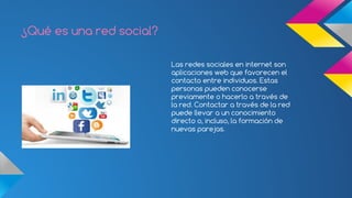Las redes sociales son aplicaciones web que fomentan el contacto entre personas permitiéndoles conocerse, interactuar e intercambiar contenido de forma inmediata. Existen diferentes tipos como redes sociales generales como Facebook y Twitter, redes profesionales como LinkedIn y redes temáticas. El éxito de las redes sociales se debe a que satisfacen la necesidad humana de relacionarse y a su facilidad de uso e intercambio de contenido multimedia.