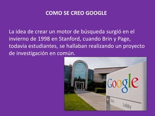 Google fue fundada en 1998 por Larry Page y Sergei Brin, dos estudiantes de Stanford que querían crear un motor de búsqueda más avanzado. Tomaron el nombre "Google" de la palabra "googol", que significa el número 1 seguido de 100 ceros, para reflejar su misión de organizar la gran cantidad de información en Internet. Google ofrece varios servicios gratuitos como Maps, Gmail y Translate, y su éxito se debe a entender la web como una red de relaciones entre documentos.