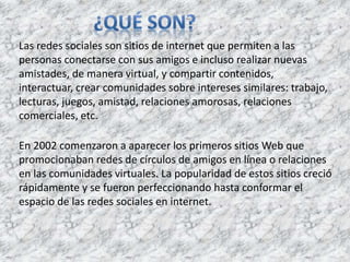 Las redes sociales permiten a las personas conectarse con amigos y hacer nuevas amistades de forma virtual, compartir contenido e interactuar. Sitios como Facebook y Twitter se han vuelto populares para mantener contacto con otros, compartir fotos y actualizaciones, y descubrir nuevos intereses. Muchas redes sociales ahora también están disponibles en dispositivos móviles.