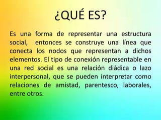 El documento aborda la estructura y análisis de las redes sociales, explicando conceptos como la centralidad, cohesión y la teoría de los seis grados de separación. Se destacan diversos tipos de redes sociales, incluyendo genéricas, profesionales y temáticas, así como ejemplos de las más utilizadas, como Facebook e Instagram. Además, se discuten herramientas y características de plataformas que facilitan la comunicación y cooperación entre usuarios en el contexto digital.