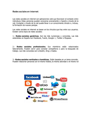 Las redes sociales permiten que los individuos se conecten e interactúen de diferentes maneras, ya sea en persona o a través de Internet. La teoría de los seis grados de separación sugiere que cada persona en el planeta está conectada a través de cadenas de conocidos de no más de seis personas. Las redes sociales en Internet facilitan aún más estas conexiones al permitir que las personas se pongan en contacto y formen nuevas relaciones.