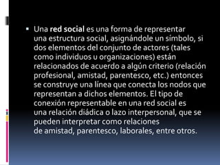 Este documento define una red social como una representación de las relaciones entre individuos u organizaciones. Explica que una red social se puede representar mediante un diagrama de nodos y enlaces, y que el análisis de redes sociales estudia esta estructura aplicando la teoría de grafos. También describe las redes sociales en Internet como plataformas que facilitan la comunicación y la interacción social. Finalmente, resalta algunas ventajas de las redes sociales como el contacto con conocidos y oportunidades profesionales, pero también señala pos