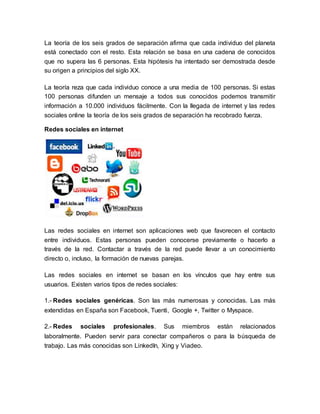 Este documento describe las redes sociales y cómo han evolucionado con el tiempo. Explica que las personas siempre han estado conectadas en grupos familiares, laborales y otros, y que ahora las redes sociales en línea permiten conexiones a través de cadenas de 6 grados de separación o menos entre cualquier persona del mundo. También describe los diferentes tipos de redes sociales en línea, incluidas las genéricas como Facebook y Twitter, las profesionales como LinkedIn, y las verticales o temáticas centradas en intereses específicos.