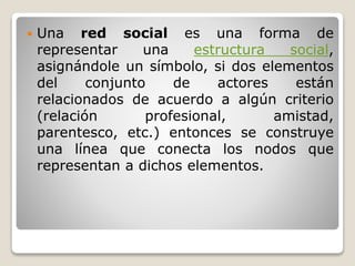 Este documento describe las redes sociales y sus usos principales. Define una red social como una estructura que representa las relaciones entre personas u organizaciones. Explica que las personas usan las redes sociales para mantener la comunicación con conocidos, hacer nuevas conexiones con personas de intereses similares, y encontrar información. También menciona que las empresas usan las redes sociales para vender productos, fortalecer su marca, y generar credibilidad y confianza.