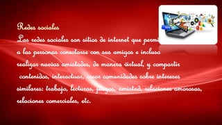 Este documento describe las redes sociales, su evolución y principales características. Explica que las redes sociales permiten a las personas conectarse con amigos de manera virtual y compartir contenidos e intereses. También describe las ventajas y desventajas de las redes sociales, así como consejos para su uso seguro.