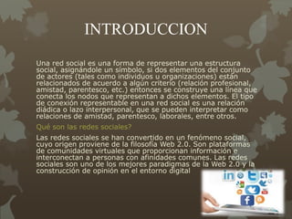 Este documento define y analiza las redes sociales. Explica que son plataformas virtuales que permiten a las personas conectarse basadas en intereses comunes. Describe algunas redes sociales populares como Facebook y Twitter. También discute los beneficios de las redes sociales como mantener el contacto con amigos y compartir información, pero también los riesgos a la privacidad y seguridad.