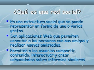 Las redes sociales son estructuras sociales que facilitan la interacción y conexión entre personas, permitiendo compartir contenido e información. Se dividen en redes analógicas (off-line) y digitales (on-line), cada una con ventajas como el trabajo colaborativo, construcción de identidades y aprendizaje integral. Ejemplos de redes sociales incluyen Facebook, Twitter, MySpace, y redes profesionales como Neurona y Xing.