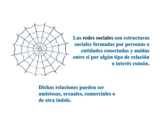 Las redes sociales son estructuras sociales que conectan personas según intereses comunes, permitiendo la creación de comunidades virtuales para compartir contenidos. Las plataformas más populares incluyen Facebook, YouTube, Twitter, Google+, LinkedIn y Pinterest, cada una con características únicas para interacciones sociales, profesionales y comerciales. Las ventajas de las redes sociales abarcan la socialización, la búsqueda de empleo y oportunidades de negocio, además de la obtención de información relevante.