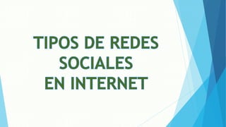 Este documento describe las redes sociales en Internet y los tipos principales de redes sociales. Explica que las redes sociales en Internet permiten el contacto entre individuos que pueden conocerse previamente o hacerlo a través de la red. A continuación, identifica tres tipos de redes sociales: 1) redes sociales genéricas como Facebook e Instagram, 2) redes profesionales como LinkedIn para conexiones laborales, y 3) redes verticales sobre temas específicos como Flickr para fotos.