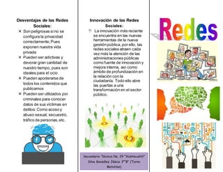 El documento describe algunas desventajas y una innovación de las redes sociales. Las desventajas incluyen que pueden exponer la privacidad si no se configura correctamente, pueden ser adictivas y consumir mucho tiempo, y pueden ser utilizadas por criminales para obtener información sobre sus víctimas. La innovación mencionada es el uso creciente de las redes sociales por las administraciones públicas para mejorar la relación con los ciudadanos y transformar el sector público.
