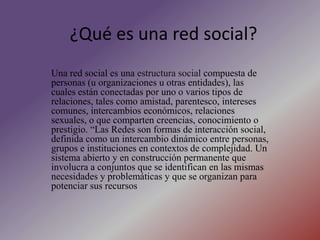 Una red social es una estructura social compuesta de personas u organizaciones conectadas por relaciones como amistad, parentesco o intereses comunes. Las redes sociales sirven para interactuar con otras personas aunque no se conozcan y hacer nuevos amigos, y pueden ser analógicas u online. Sus funciones incluyen compañía social, apoyo emocional, consejos, regulación social y acceso a nuevos contactos.