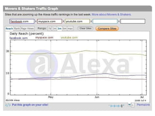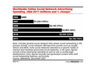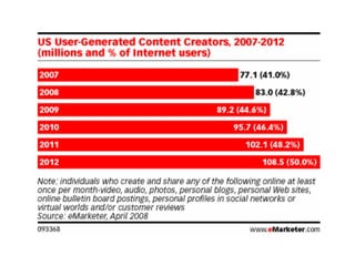 El documento describe el surgimiento de la Web 2.0 y las redes sociales, las cuales han cambiado la forma en que las personas, organizaciones y la sociedad se comunican y comparten información de manera colaborativa. Explica que la Web 2.0 se basa en comunidades de usuarios y servicios como blogs, wikis y redes sociales que fomentan la participación y el intercambio de contenido generado por los propios usuarios. También analiza el impacto de estas tecnologías en los modelos de negocio, comunicación y en la construcción
