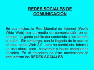 El documento describe el surgimiento y evolución de las redes sociales en Internet. Comenzaron como sitios para que la gente publique contenido que otros puedan leer, pero con la Web 2.0 se volvieron plataformas para conversar y conectarse socialmente. Algunos de los primeros sitios populares de redes sociales fueron Friendster, Myspace y LinkedIn. Hoy en día, las redes sociales más grandes son Facebook, Twitter y otras como Instagram, permitiendo a las personas compartir y interactuar online.