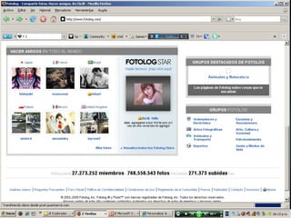 Las redes sociales se usan como diarios personales donde las personas actualizan periódicamente su contenido y se retroalimentan entre sí, se destacan las fotos compartidas y son usadas principalmente por adolescentes. Permiten formar grupos con intereses en común, enviar regalos y mensajes, y compartir fotos.