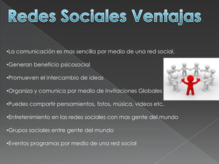 El documento describe las principales ventajas y desventajas de las redes sociales, incluyendo la facilidad de comunicación, beneficios psicosociales, intercambio de ideas, organización de eventos y entretenimiento, pero también el robo de información personal, pérdida de tiempo, adicción y falta de privacidad. La conclusión es que las redes sociales pueden ser útiles pero también requieren precaución debido a la difusión de información falsa y riesgos para la seguridad personal.