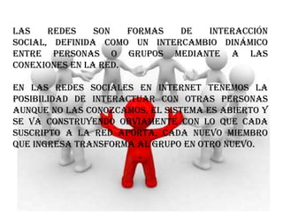 Este documento describe la historia y el funcionamiento de las redes sociales en Internet. Explica que las redes sociales permiten la interacción dinámica entre personas a través de conexiones en línea. Detalla que sitios como Friendster, Tribe y Myspace se hicieron populares en 2003 y que Facebook se convirtió en un exitoso negocio al enfocarse en estudiantes de manera similar a Myspace. También provee instrucciones sobre cómo crear una cuenta en Facebook para agregar amigos, fotos y modificar el perfil.