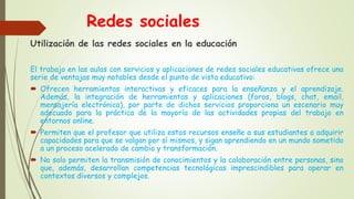 Las redes sociales ofrecen herramientas interactivas que proporcionan un escenario adecuado para actividades de aprendizaje. Permiten enseñar capacidades para aprender en un mundo en cambio y desarrollar competencias tecnológicas. Generan ingresos a través de publicidad dirigida según los intereses y datos de los usuarios.