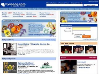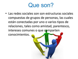 Las redes sociales son estructuras sociales compuestas de grupos de personas conectadas por relaciones como amistad o intereses comunes. Sirven para compartir fotos, videos y ver contenidos de otros, siendo Facebook, Twitter y Myspace algunas de las más utilizadas. Facebook fue creado por Mark Zuckerberg y es la red social más grande, Twitter permite enviar mensajes cortos y fue creado por Jack Dorsey, y Myspace incluye perfiles, grupos y música.