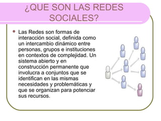 Este documento describe las redes sociales en Internet. Explica que las redes sociales son formas de interacción social entre personas, grupos e instituciones que comparten intereses y necesidades. Cada miembro es importante porque aporta valor y transforma la red. Las redes sociales evitan el aislamiento al permitir que la gente encuentre a otros con quien compartir. Surgen en 2001-2002 y su funcionamiento básico implica que los miembros inviten a amigos y conocidos a unirse, lo que permite un crecimiento exponencial de la red.