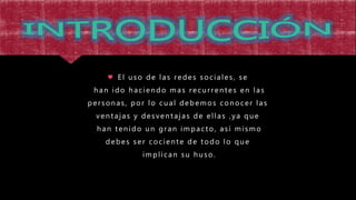 El documento describe las ventajas y desventajas de las redes sociales. Permite conectarse con amigos y conocer gente nueva, pero también puede generar adicción y exponer datos personales. Explica cómo funcionan las redes sociales más populares como Facebook, Instagram y Twitter, y enfatiza que los usuarios deben decidir cuidadosamente cómo usarlas.