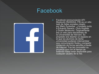 Facebook fue creado originalmente como un sitio para estudiantes de la Universidad de Harvard para compartir contenido de forma sencilla a través de Internet. Más tarde se expandió para estar disponible para cualquier usuario. WhatsApp es una aplicación gratuita para enviar y recibir mensajes, imágenes, videos y audio a través de Internet. Instagram es una red social para compartir fotos y videos con efectos y filtros.