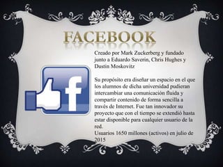 Este documento presenta una lista de las principales redes sociales, sus creadores, número de usuarios y breve descripción. Entre ellas se encuentran Facebook, YouTube, WhatsApp, Instagram, LinkedIn, Twitter, Line, Tumblr, Skype, Pinterest, Vine, Myspace, Spotify, Flickr, Hi5, Tuenti y Snapchat.