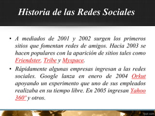 Las redes sociales en línea se han vuelto populares desde principios de los 2000, con sitios como Friendster, Myspace y Facebook que permiten a los usuarios crear perfiles y conectarse con amigos. El documento luego describe brevemente la historia y funcionalidad básica de varias redes sociales populares de habla hispana, como Tuenti en España y Orkut de Google. Finalmente, identifica a Facebook, Hi5 y Skyrock Blog como algunas de las redes sociales con mayor éxito a nivel mundial.