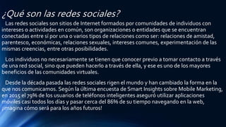 Este documento describe las redes sociales Facebook y WhatsApp. Explica que Facebook fue creada en 2004 por Mark Zuckerberg para conectar a estudiantes universitarios y ahora tiene más de 1000 millones de usuarios. WhatsApp es una aplicación de mensajería gratuita fundada en 2009 que permite enviar mensajes de texto, imágenes y llamadas a través de Internet. Ambas redes sociales son muy populares y han crecido rápidamente en los últimos años, con WhatsApp alcanzando los 1000 millones de usuarios.