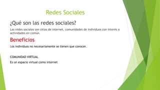 Este documento resume diferentes tipos de redes sociales como Facebook, Twitter, Google+, YouTube, Flickr y LinkedIn. Explica brevemente el propósito y características de cada una. También describe la historia y evolución de plataformas como SlideShare y blogs. En general, ofrece una introducción a las principales redes sociales existentes y cómo han cambiado con el tiempo.