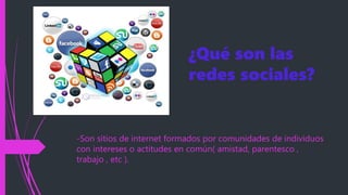 Este documento describe diferentes tipos de redes sociales como Facebook e Instagram que son horizontales y dirigidas a un público general, y LinkedIn y YouTube que son verticales y se especializan en un tema en particular como videos o empleos. También proporciona detalles sobre las funciones y orígenes de Facebook y Twitter, las cuales permiten a los usuarios compartir actualizaciones, fotos y videos con sus amigos y seguidores.