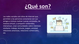 Las redes sociales son plataformas que facilitan la conexión y comunicación entre personas, permitiendo compartir contenidos y crear comunidades en torno a intereses comunes. Aunque ofrecen ventajas como mantener la comunicación y vencer la timidez, también presentan desventajas como el riesgo de ciberbullying y la pérdida de interacciones sociales reales. A pesar de sus retos, las redes sociales se han convertido en una herramienta esencial en la vida moderna, promoviendo una revolución tecnológica en la comunicación.