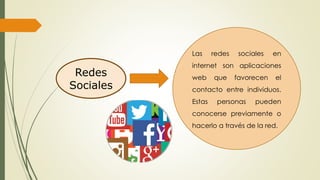 El documento proporciona información sobre redes sociales, e-marketing y e-commerce. Explica que las redes sociales permiten el contacto entre individuos y ofrecen ventajas para las empresas como aumentar la visibilidad de la marca. También describe el e-marketing como la utilización de Internet para el marketing directo y el e-commerce como la distribución y venta de productos a través de Internet.