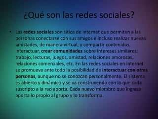 Este documento describe las redes sociales, incluyendo que permiten a las personas conectarse con amigos y hacer nuevas amistades virtualmente, compartir contenido e interactuar. También explica que las redes sociales se usan para mantener la comunicación con conocidos, renovar amistades perdidas, encontrar nuevas conexiones basadas en intereses comunes, encontrar información, promocionarse a uno mismo y hacer networking profesional. Además, resalta algunas ventajas como mayor comunicación e interacción entre jóvenes, estar mejor informados y vencer la timide