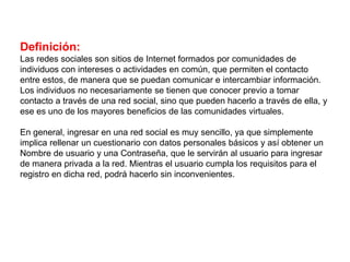 El documento describe las redes sociales como plataformas que conectan personas con intereses comunes, permitiendo la comunicación y el intercambio de información. Se clasifican en géneros como genéricas, profesionales, de geolocalización y de contenidos, y se analizan su evolución, ventajas y desventajas. También se menciona un ranking de las redes sociales más populares y se destaca el funcionamiento de plataformas específicas como Facebook, WhatsApp, YouTube, y LinkedIn.
