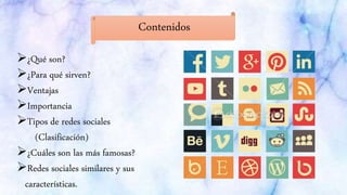 Este documento describe las redes sociales, incluyendo su definición, propósitos, ventajas e importancia. Explica los diferentes tipos de redes sociales como horizontales, verticales, de contenido y locales. También menciona algunas de las redes sociales más populares como Facebook, Twitter, YouTube e Instagram. Finalmente, compara características de redes sociales similares como Facebook y Vampire Freak, Instagram y Flickr, YouTube y Vimeo, entre otras.