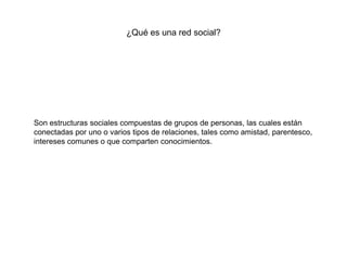 Las redes sociales son estructuras sociales compuestas de grupos de personas conectadas por relaciones como amistad o intereses comunes. El análisis de redes sociales estudia estas estructuras aplicando teoría de grafos e identificando personas como nodos y relaciones como enlaces. En internet, las redes sociales se basan en la teoría de los seis grados de separación, que sugiere que cualquier persona puede estar conectada a través de una cadena de seis conocidos. Proporcionan actualización automática de contactos y perfiles visibles.