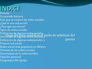 Este documento habla brevemente sobre la historia y el propósito de las redes sociales. Explica que las primeras redes sociales surgieron alrededor de 2001-2002 y que sitios como Friendster, Tribe y Myspace se hicieron populares en 2003. También define qué es una red social, menciona algunos tipos y ejemplos como Facebook, Twitter y YouTube, y discute brevemente las ventajas y desventajas de su uso.
