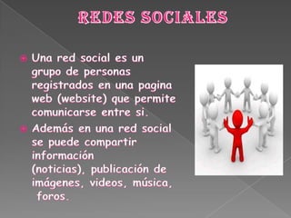 El documento habla sobre redes sociales. Define una red social como un grupo de personas registradas en una página web que permite comunicarse entre sí y compartir información, publicaciones, imágenes, videos, música y participar en foros. Da como ejemplos de redes sociales populares a Facebook, Twitter, Flickr, Hi5, Wordpress y Myspace.