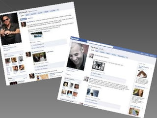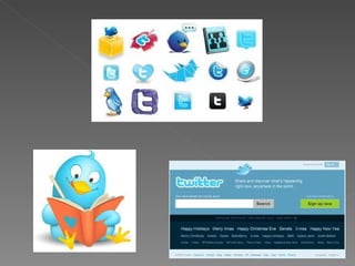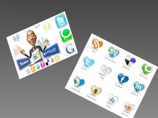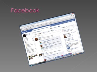 Las redes sociales son estructuras sociales compuestas de grupos de personas conectadas por relaciones como amistad o intereses comunes. Facebook es un sitio de redes sociales creado por Mark Zuckerberg que permite a los usuarios crear perfiles, agregar amigos y compartir contenido. Twitter es una red social basada en el microblogging que permite a los usuarios enviar y leer tweets de hasta 140 caracteres.