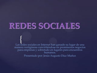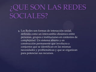 Las redes sociales en Internet han ganado popularidad rápidamente como negocios y lugares para conexiones humanas. Las redes sociales permiten la interacción entre personas a través del intercambio dinámico en contextos complejos. Cada miembro es importante ya que cada nuevo usuario transforma y construye la red. Las redes sociales evitan el aislamiento al permitir que la gente comparta intereses y rompa el aislamiento.